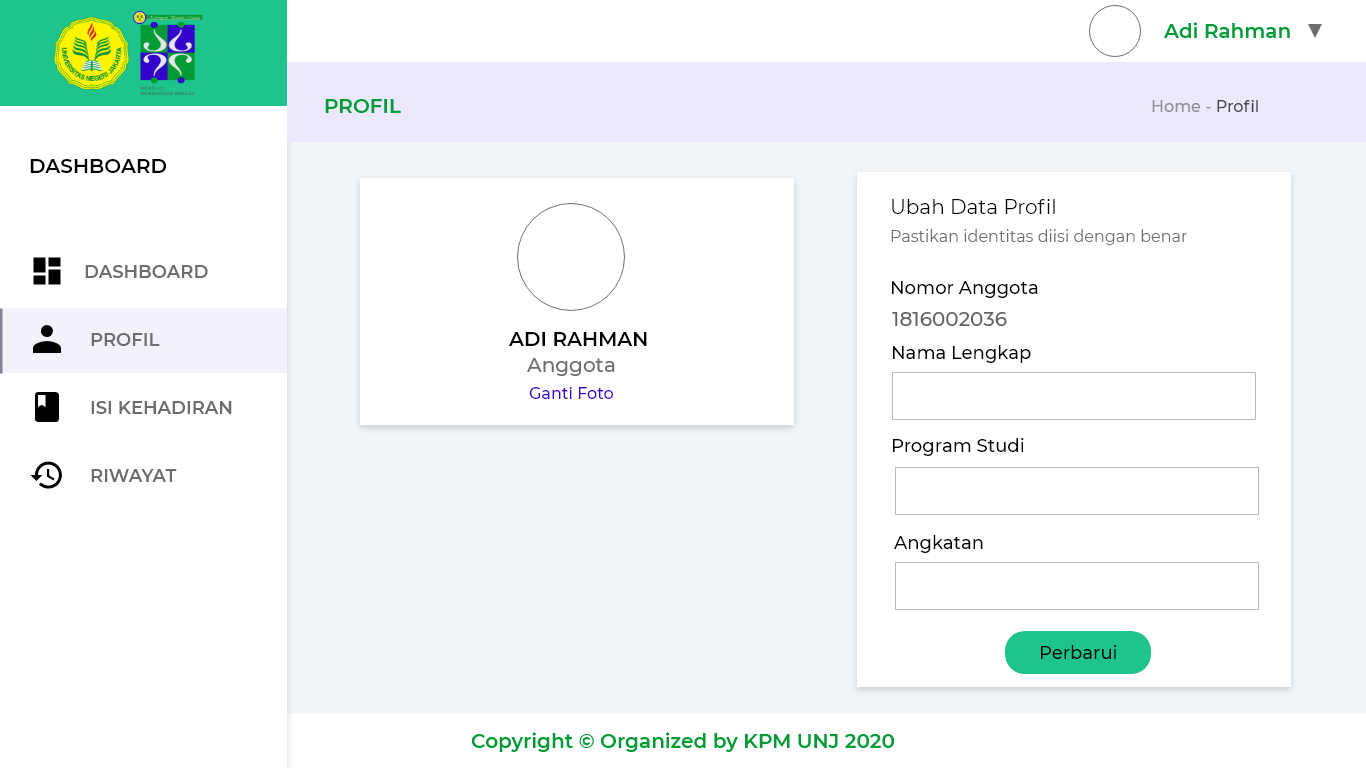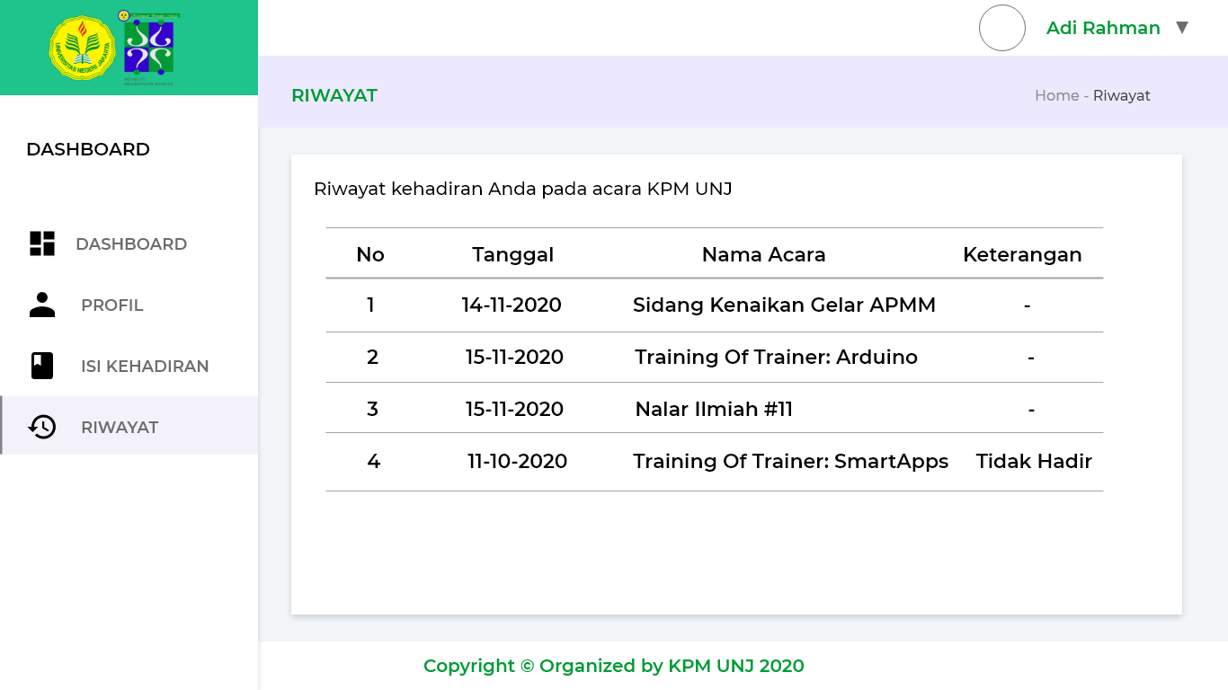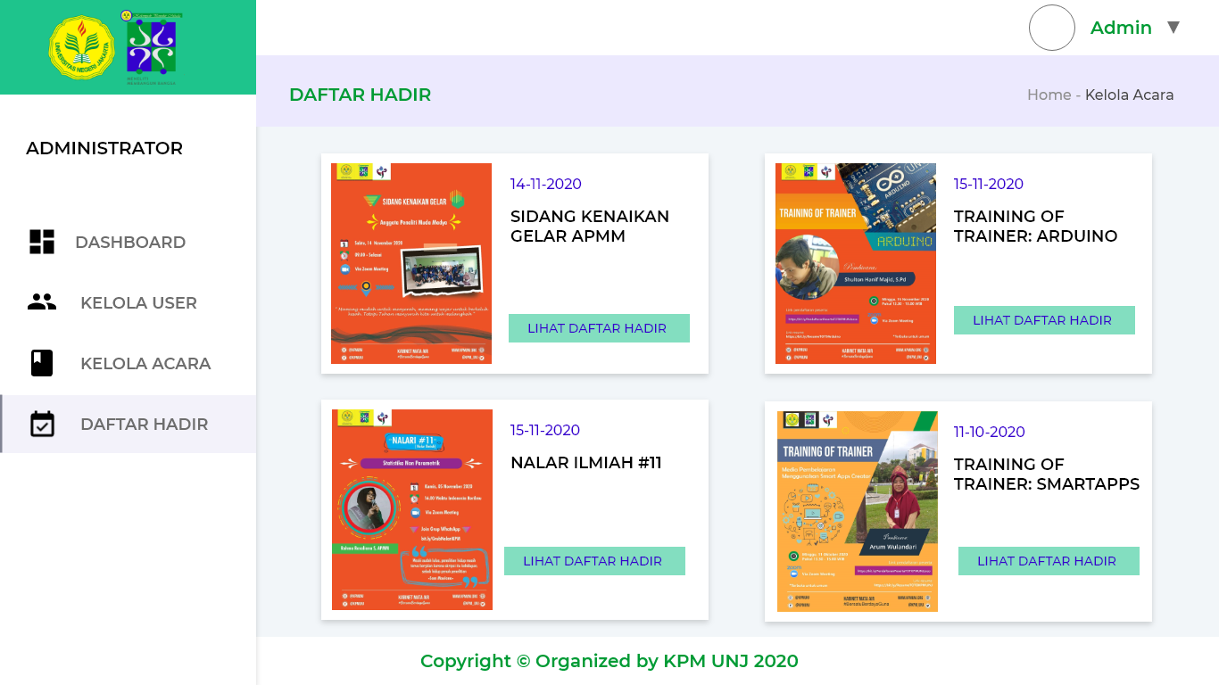 SIPKU is a website-based attendance system that has the function of making attendance easily without the need to fill in the attendance form which is usually given on the sidelines of the agenda you are currently participating in. SIPKU offers features that can be used based on the role of the account that is accessing it. SIPKU has two types of accounts, namely admin and User. SIPKU itself uses an approach where the admin is in full control of who can access the SIPKU website. Later the admin can create accounts for all KPM UNJ members so that they can improve integrity and map the use of a more structured website. You can see something similar on the website (http://siakad.unj.ac.id/).