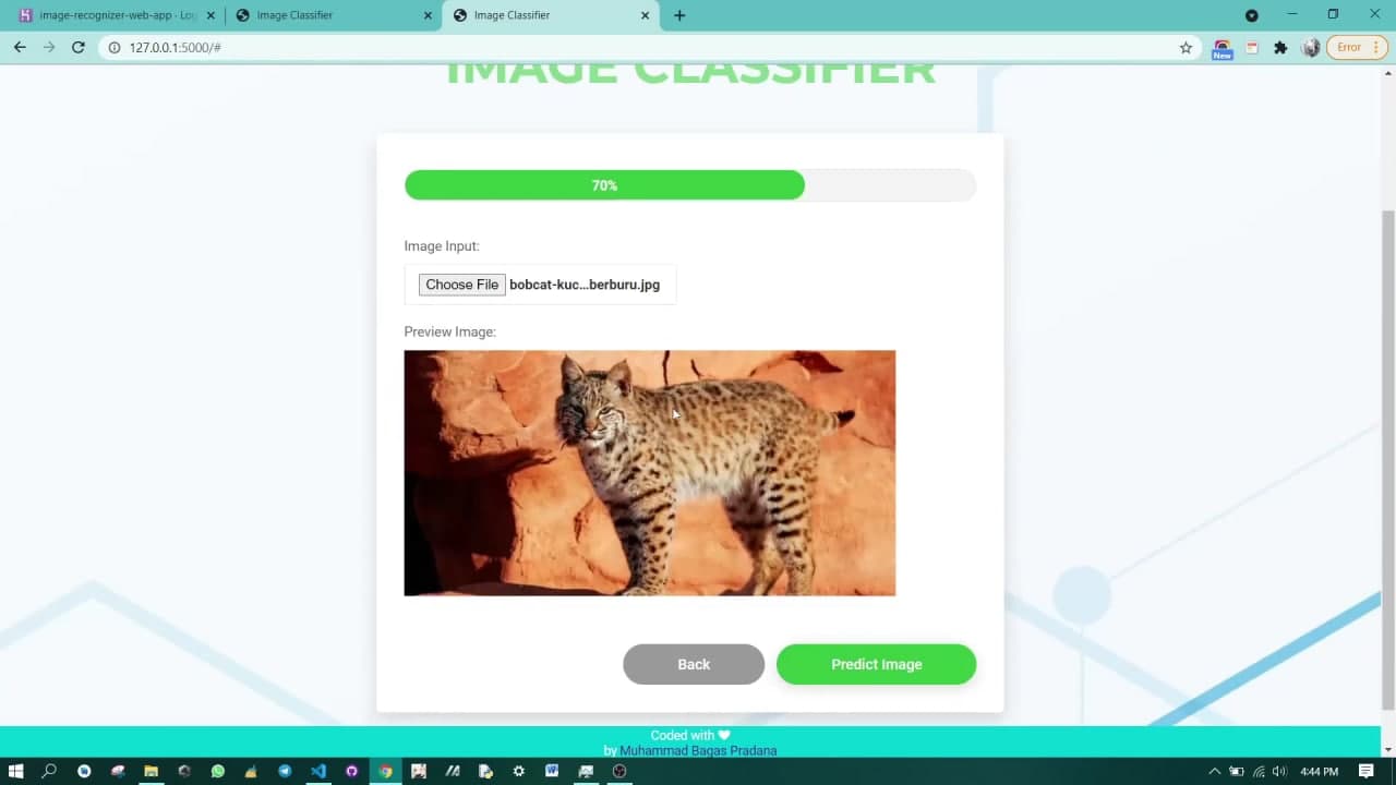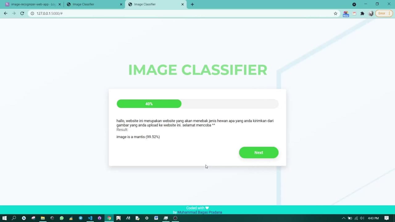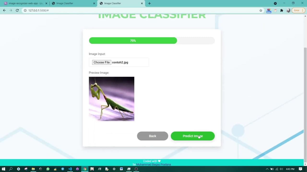 image recognizer is a Web application that can guess what image you send to this website. This web application uses Deep Learning with a total dataset used of 102.967.424 (one hundred and two million nine hundred sixty-seven thousand four hundred and twenty-four). Accuracy reaches has been obtain is 92.8%.