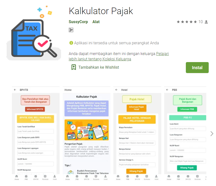 kalkulator pajak is an application that specifically calculates taxes including PBB tax, BPHTB, Hotel tax, and Restaurant tax based on local tax regulations in Indonesia. This application is designed to help those of you who want to know how much tax you receive from the assets you calculate. In addition, this application can also be used to help people who work in the scope of taxation in Indonesia.
